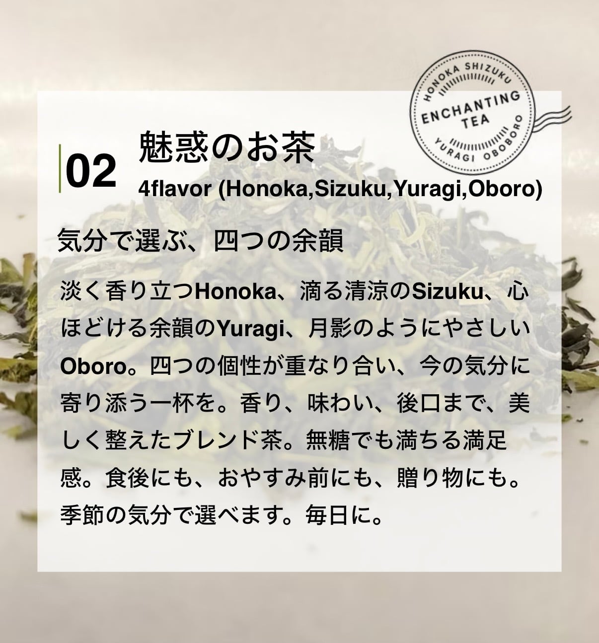 淡く香り立つHonoka、滴る清涼のSizuku、心ほどける余韻のYuragi、月影のようにやさしいOboro。